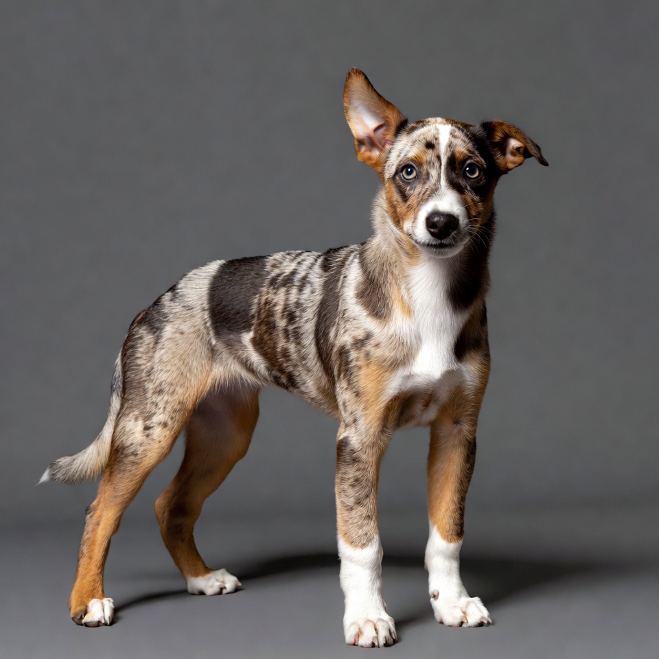 A young merle puppy with a tri-colored coat of black, brown, and white stands alert on a solid gray background. Its perked ears, blue eyes, and white paws are prominent. The puppy poses confidently with a straight tail.