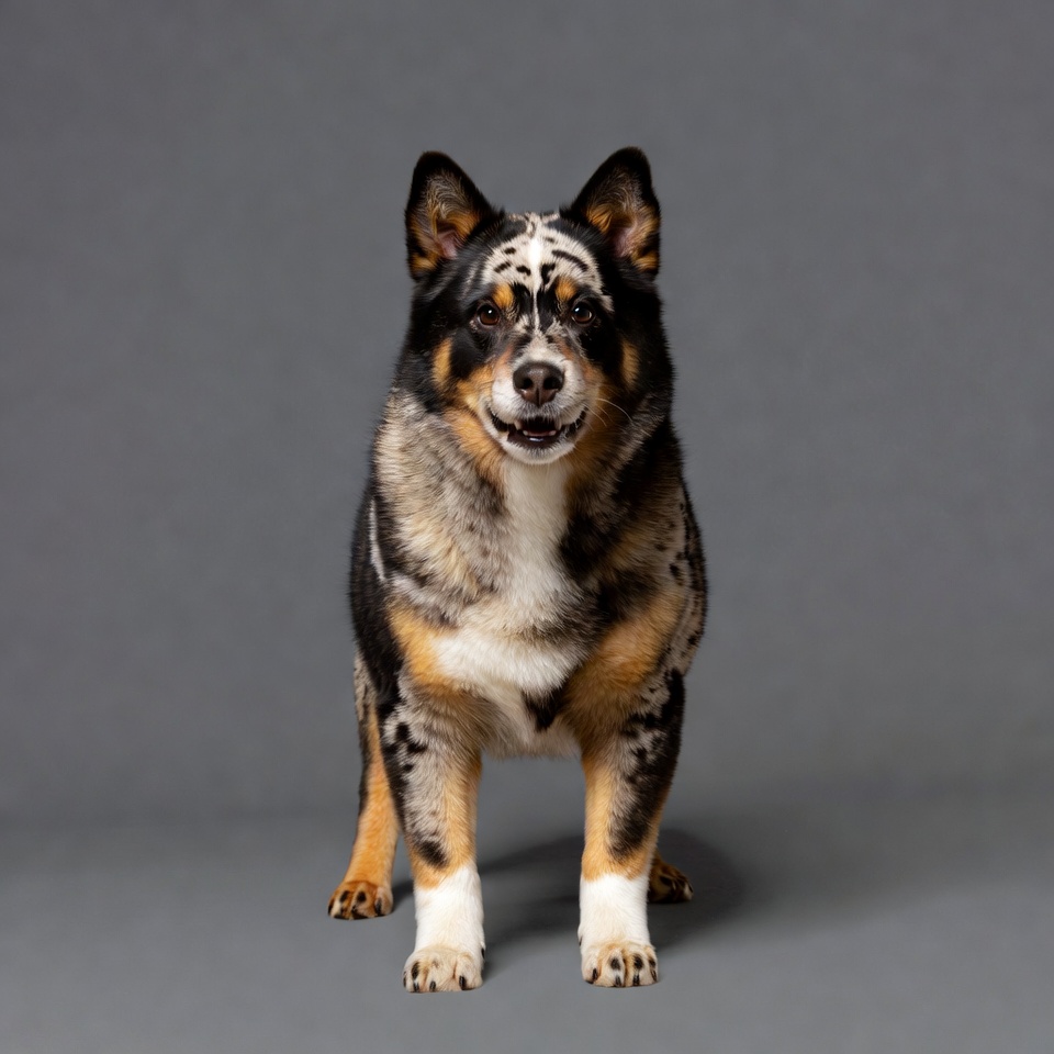 A merle-coated Australian Shepherd dog stands on a gray background. The dog has a tri-colored coat with black, white, and tan markings, perky ears, and a smiling expression. Its paws are white and it faces the camera directly.