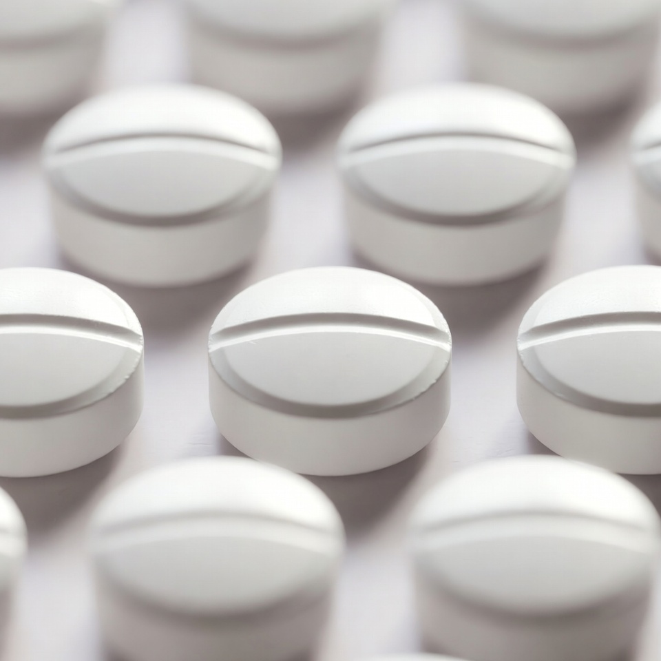 Numerous round white pills with a dividing line are arranged in a dense pattern on a flat white surface. The image features a shallow depth of field with the central pills in sharp focus while the background ones are slightly blurred. The composition emphasizes the uniformity and texture of the pharmaceutical tablets.
