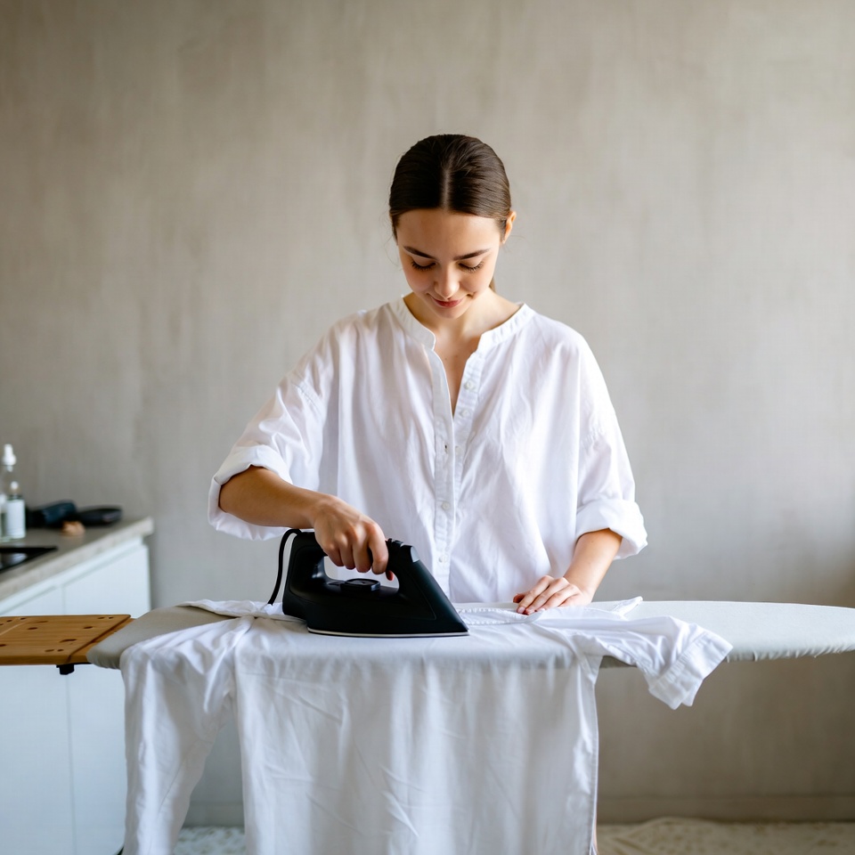 A young woman with brown hair tied back stands in a modern kitchen, ironing a white shirt on an ironing board. She wears a loose white button-up shirt with rolled sleeves and holds a black steam iron carefully. The background features light gray walls and white kitchen cabinets.