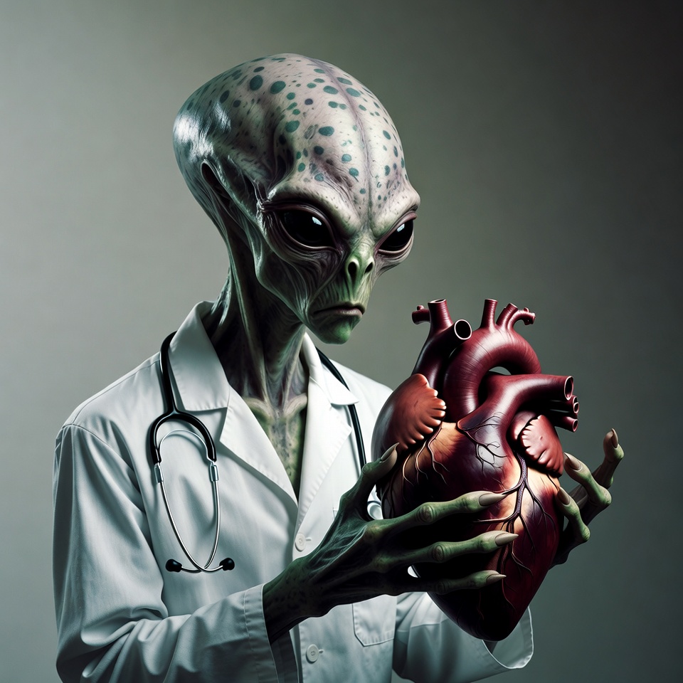 A grey alien with large black eyes and spotted skin wears a white lab coat and stethoscope. It holds a realistic red human heart in its green hands against a dark background. The alien has an elongated head and slender limbs.