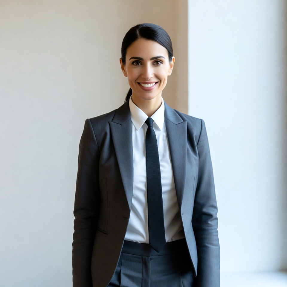A woman with dark hair in a ponytail stands smiling confidently against a light indoor background near a window. She wears a tailored gray suit jacket, matching pants, white dress shirt, and black tie. Her expression is professional and approachable.