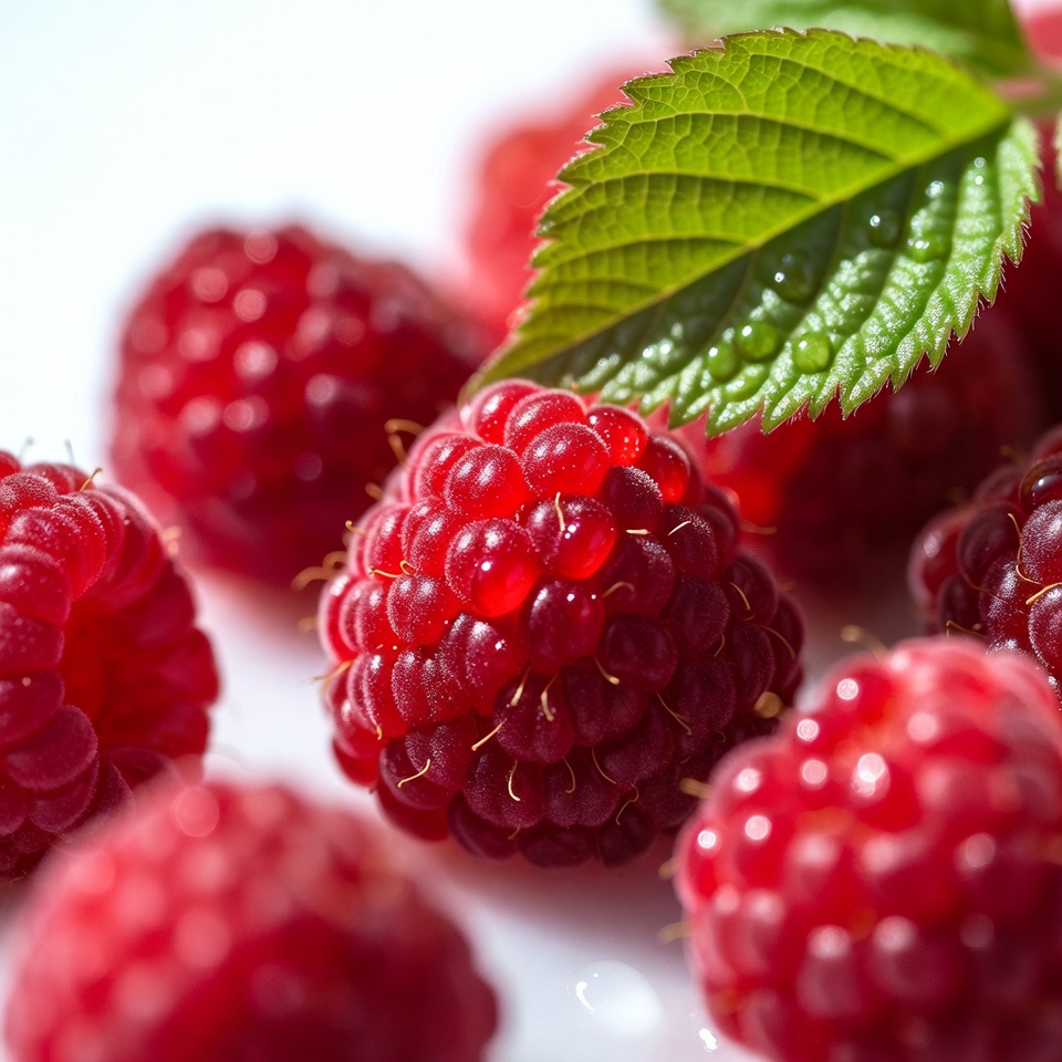 A cluster of vibrant red raspberries sits on a white background. Fresh green leaves with water droplets are placed among the berries. The raspberries display detailed textures with tiny bumps and glossy surfaces.