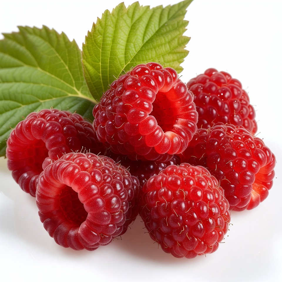 A cluster of ripe red raspberries is arranged on a white background. Several fresh green leaves from the raspberry plant surround and partially cover the berries. The raspberries display their textured, juicy surfaces with some showing open centers.