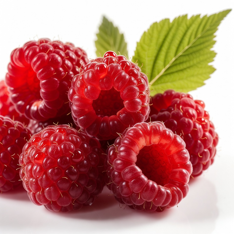 A cluster of fresh red raspberries is arranged on a white background. Several green leaves from the raspberry plant are positioned among the berries. The raspberries display their textured, juicy surfaces prominently.