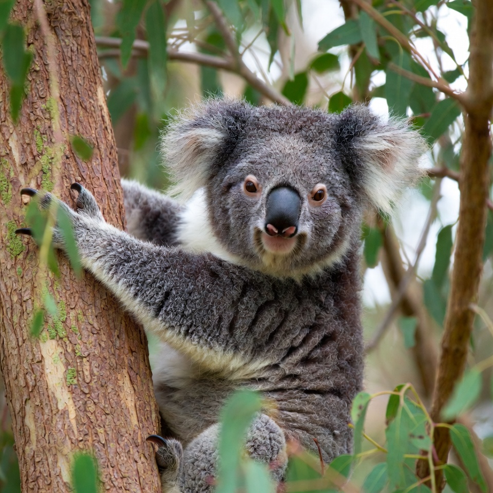 Australian animal, adorable, black nose, branches, claws, climbing, eucalyptus tree, fluffy, gray fur, green leaves, marsupial, nature, outdoors, tree trunk, wildlife, koala