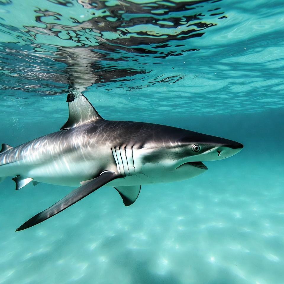 aquatic, black fins, clear water, fins, fish, gills, gray shark, marine life, ocean, predator, sea, shark, swimming, turquoise water, underwater, blacktip shark
