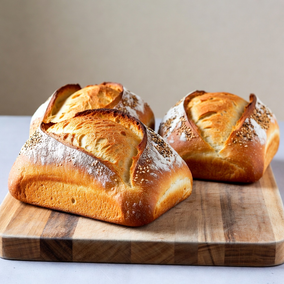 Three golden-brown loaves of artisan bread with scored tops and sesame seeds sit on a wooden cutting board. Flour dusts the crusts, highlighting the fresh-baked texture. The breads are arranged closely together against a light background.
