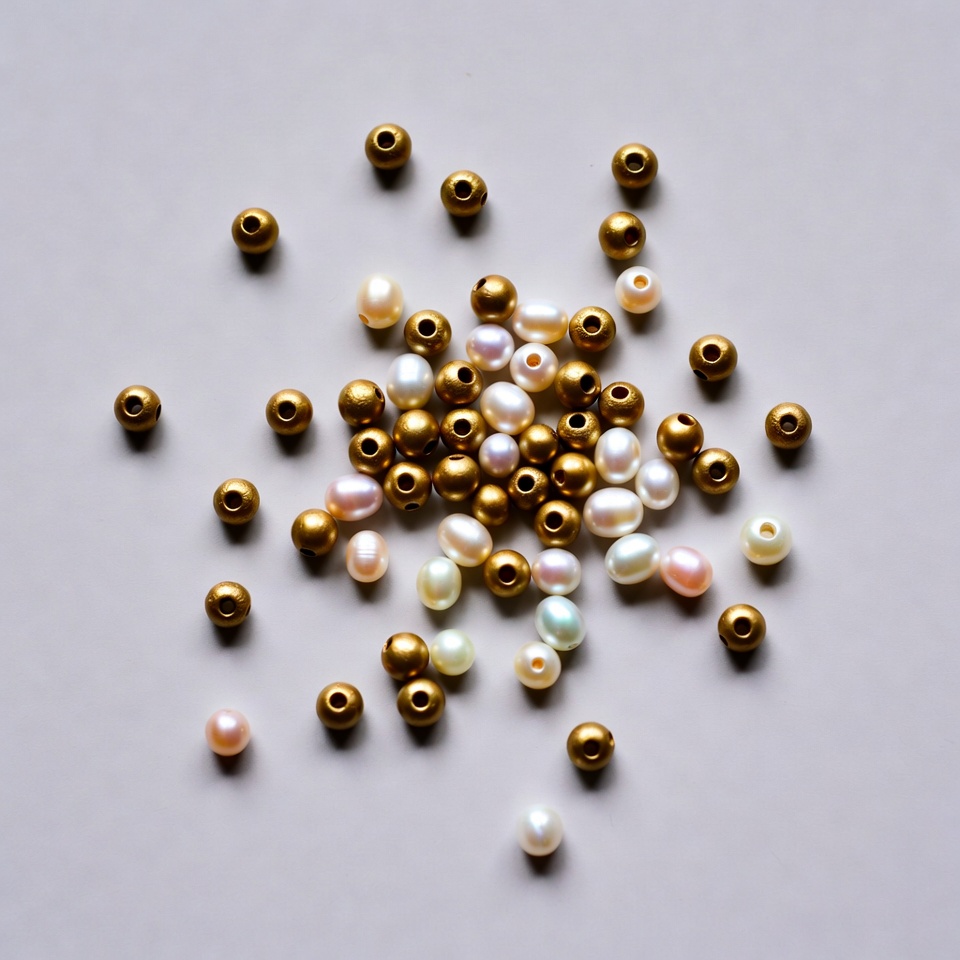 bead assortment, bead pile, beading supplies, craft beads, glossy pearls, gold beads, gold pearls, gray background, jewelry beads, jewelry making, loose beads, metal beads, pearl beads, round beads, scattered beads, shiny beads, small beads, top view, white pearls, beads