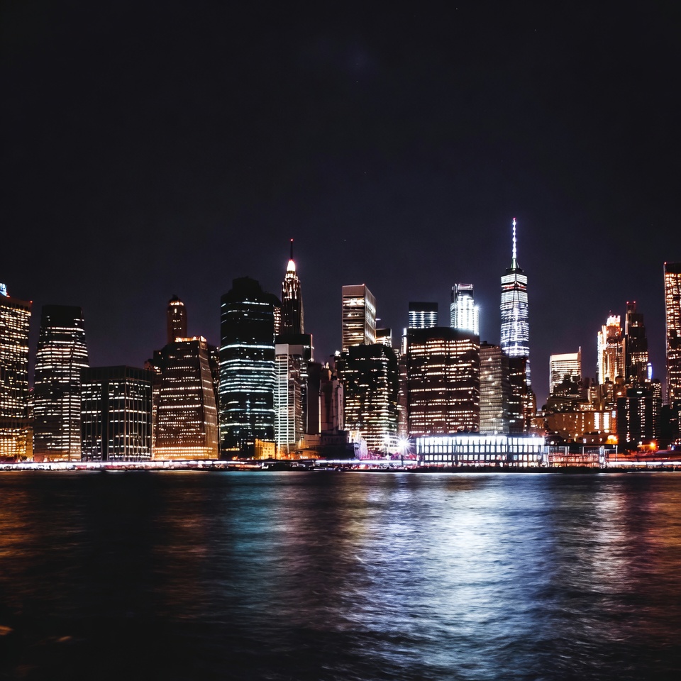 Freedom Tower, Hudson River, Manhattan skyline, NYC skyline, One World Trade Center, city lights, cityscape, dark sky, glowing lights, illuminated buildings, modern architecture, night photography, night view, reflection, river, skyscrapers, tall buildings, urban landscape, waterfront, New York City