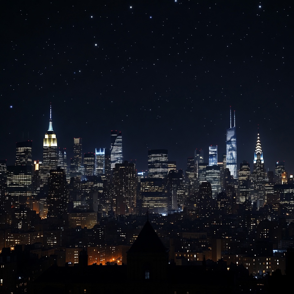 A stunning nighttime view of the New York City skyline features iconic skyscrapers illuminated against a starry sky. Prominent buildings include the Empire State Building with its glowing spire, One World Trade Center, and Chrysler Building. The city lights twinkle below a dark, star-filled heaven.