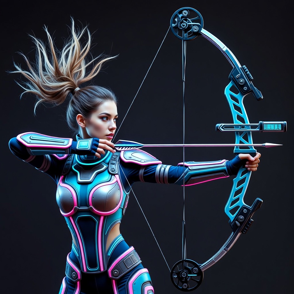 A young woman with long blonde hair in a ponytail draws a neon blue futuristic bow and arrow. She wears glowing cyan and pink cyberpunk armor with metallic shoulder guards and gauntlets. The image is rendered in a 3D digital art style against a black background.