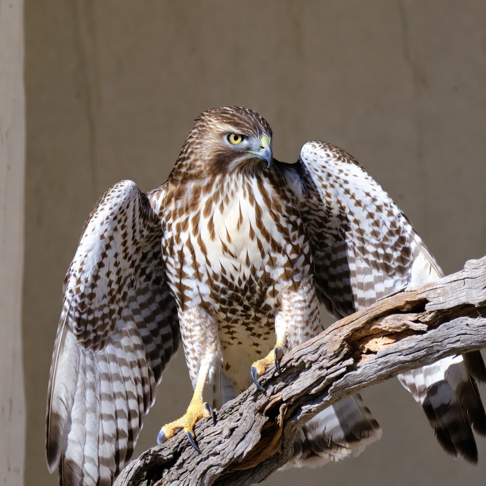 A red-tailed hawk with brown and white speckled feathers perches on a gnarled wooden branch. Its wings are partially spread, revealing white and brown patterns, and its yellow talons grip the wood firmly. The hawk stares forward with piercing yellow eyes and a sharp beak.