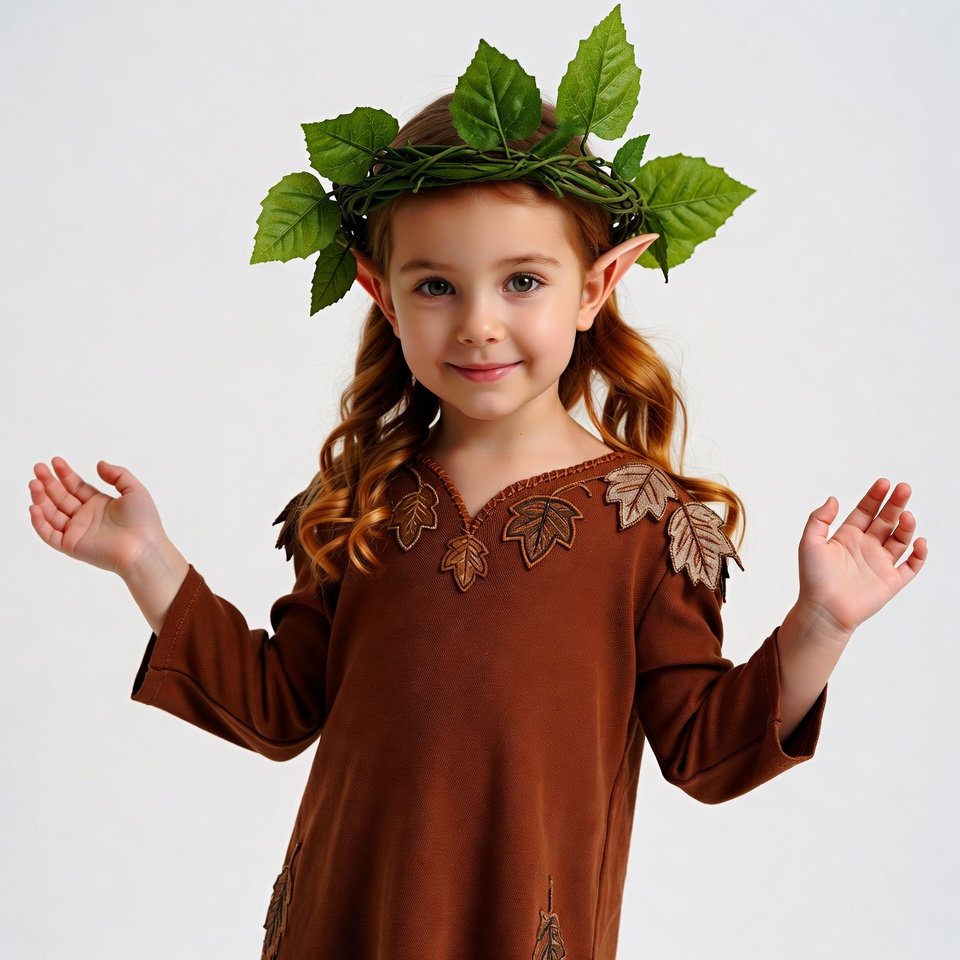 A young girl with curly red hair wears a green leaf wreath crown and pointed elf ears. She is dressed in a brown long-sleeved dress adorned with leaf embroidery. She stands with arms outstretched against a white background.