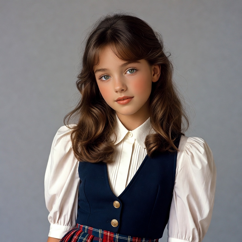 White, bangs, brown hair, buttons, collared shirt, fashion, female, isolated background, navy vest, plaid skirt, portrait, puffed sleeves, retro style, school uniform, smiling, wavy hair, white blouse, young girl, girl