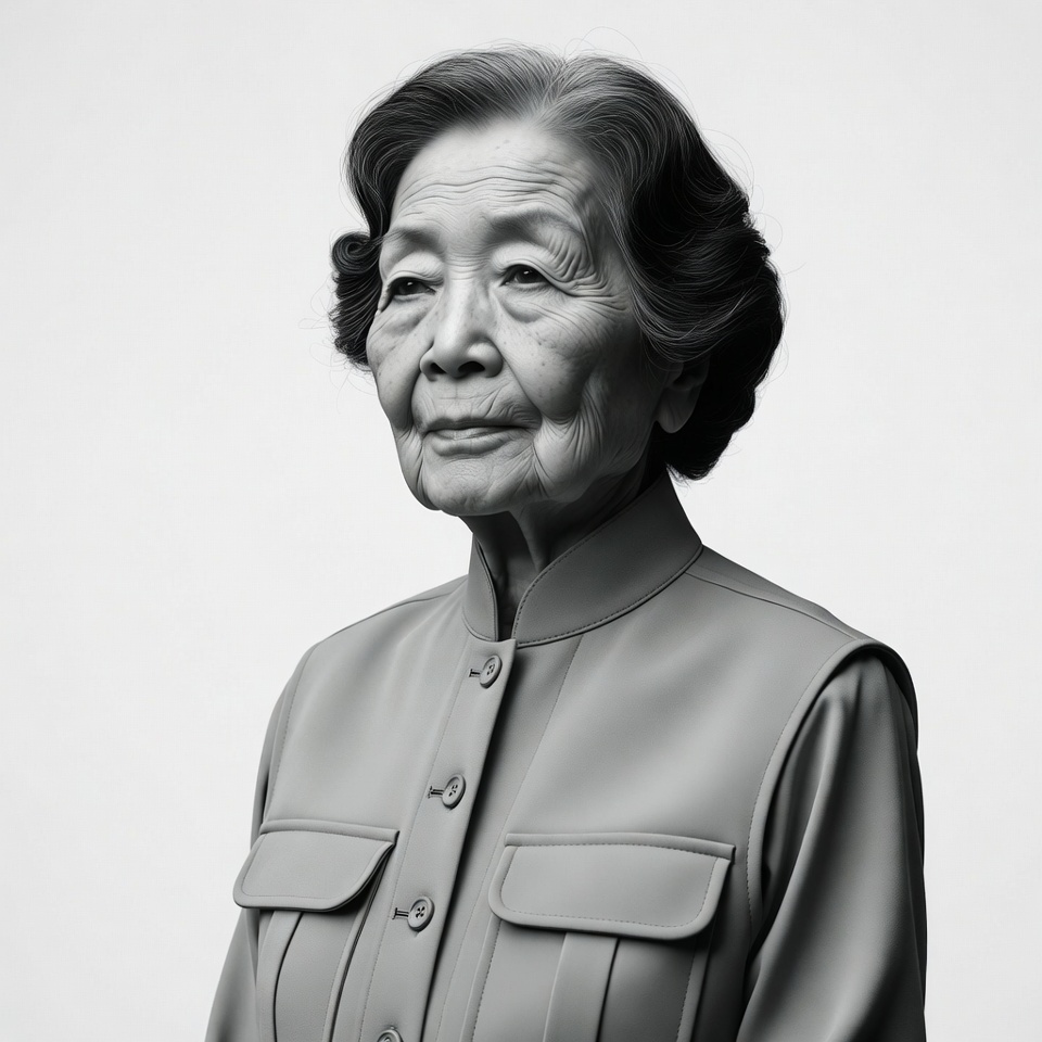 A close-up portrait of an elderly Asian woman with neatly styled gray hair gazes slightly to the side against a plain white background. She wears a collared gray vest with buttons and pockets, featuring subtle wrinkles on her face. The grayscale image highlights her serene expression and traditional attire details.