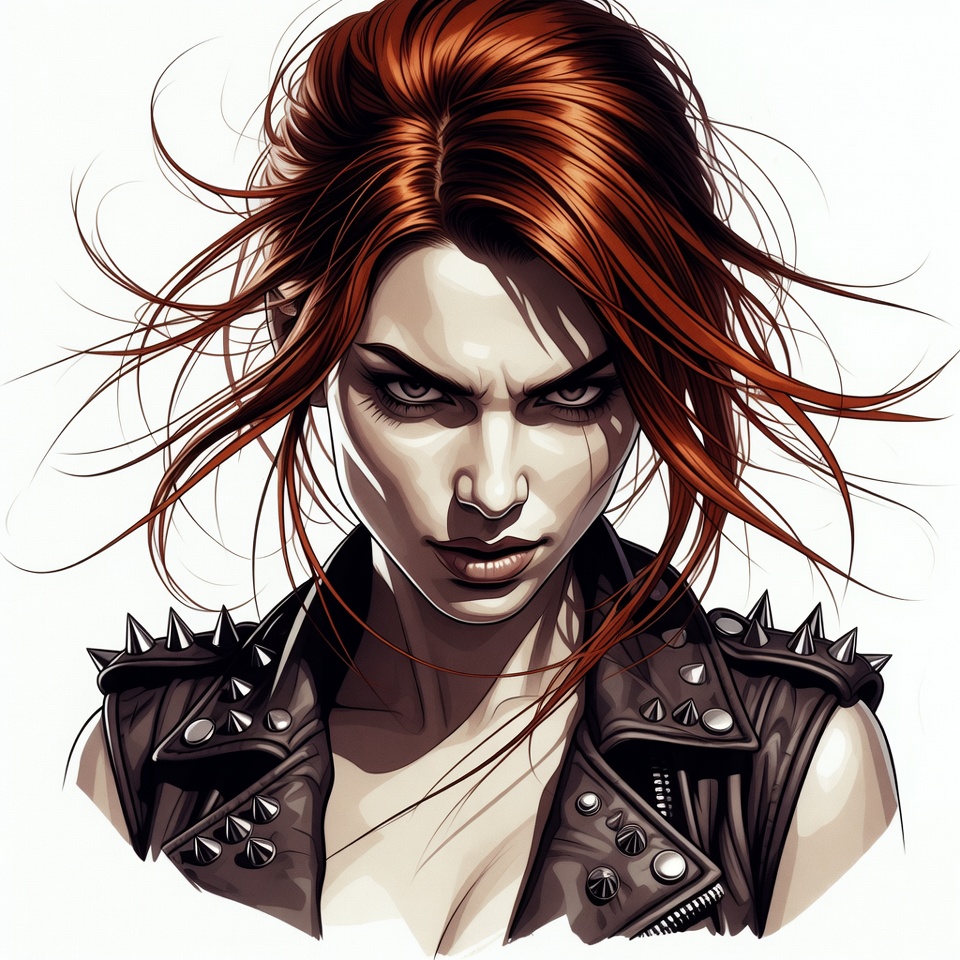A fierce digital illustration of a woman with flowing red hair and intense eyes stares directly forward. She wears a black leather jacket adorned with metal spikes on the shoulders. The portrait is set against a white background.