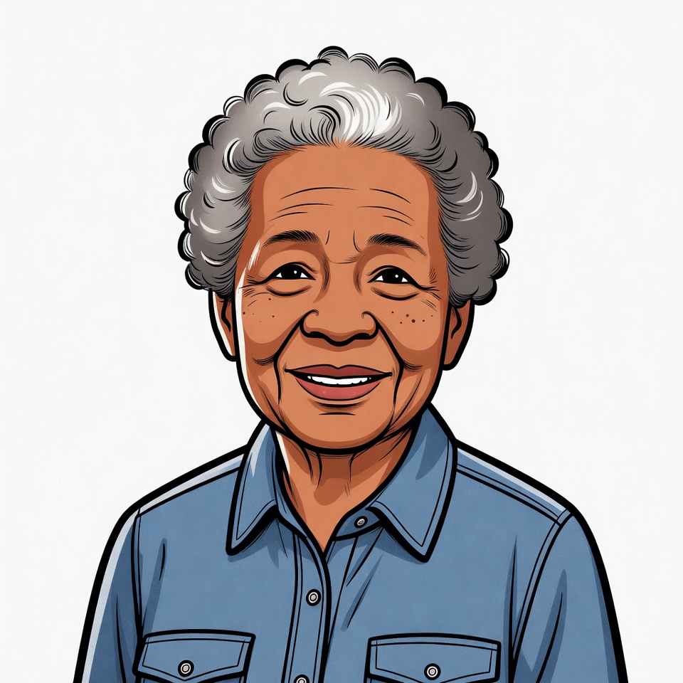 A cartoon illustration of an elderly African-American woman with curly gray hair smiles warmly at the viewer. She has a round face with visible freckles and wears a blue collared shirt. The image is isolated on a white background.