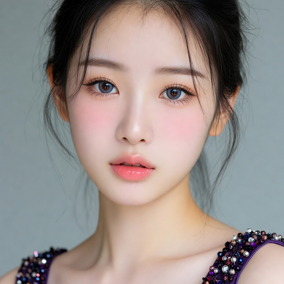 A young Asian woman with long black hair tied in a ponytail gazes at the camera. She has prominent pink blush on her cheeks, glossy pink lips, and subtle eye makeup with blue-gray contacts. She wears a sparkling beaded strap on her shoulder against a plain background.