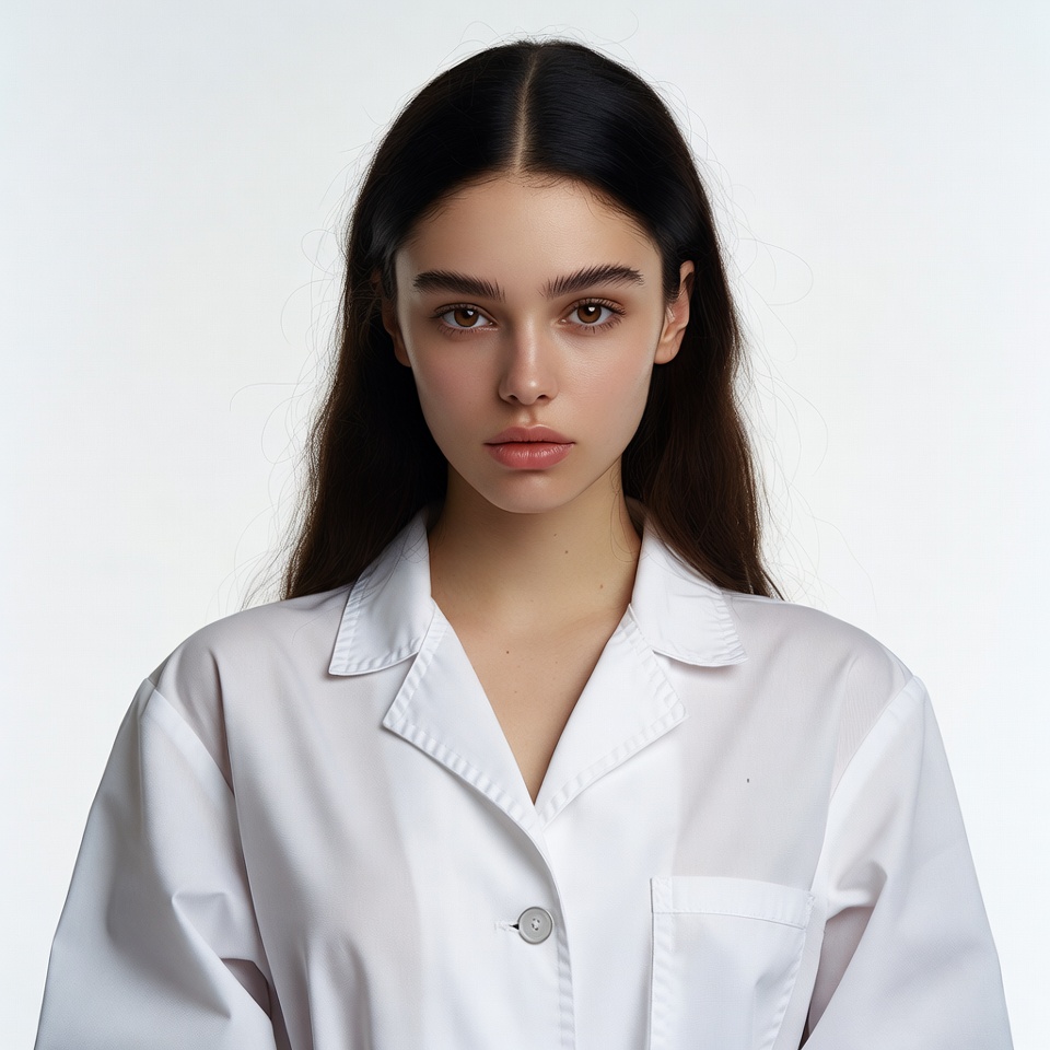 A young woman with long dark hair stands against a white background wearing a white lab coat with notched lapels and buttons. She has striking hooded eyes and subtle makeup, gazing directly at the camera. The lab coat features a chest pocket and is tailored with long sleeves.