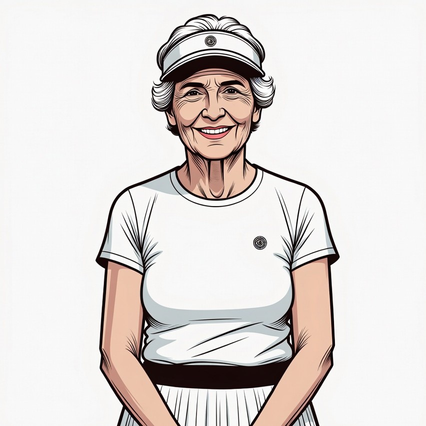 An illustration of a smiling elderly White woman wearing a white visor cap, white t-shirt with logo, black belt, and white pleated tennis skirt. She stands frontally with hands clasped in front, on an isolated white background. Her silver hair frames her cheerful face.