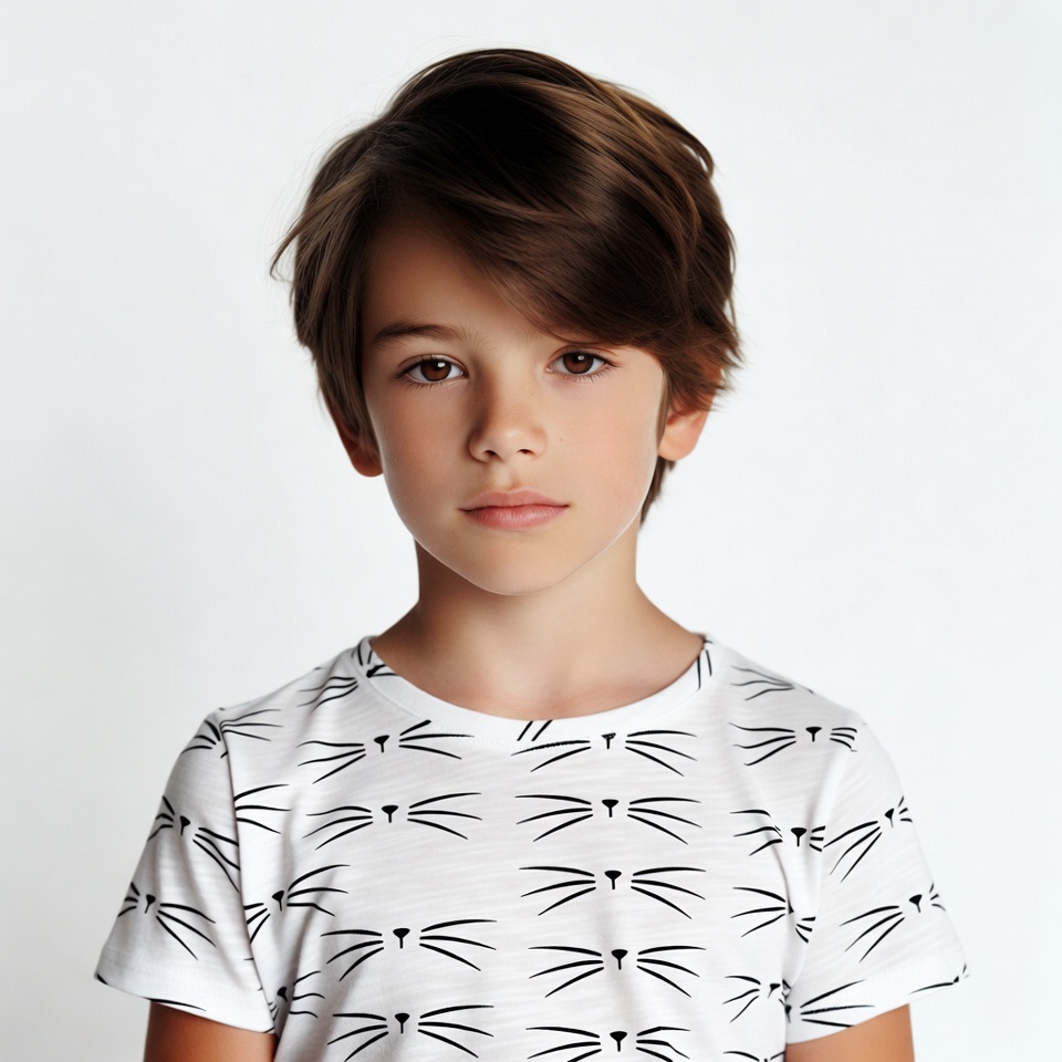 A young boy with tousled brown hair stands against a white background. He wears a white short-sleeved t-shirt printed with multiple black cat faces. He looks directly at the camera with a neutral expression.
