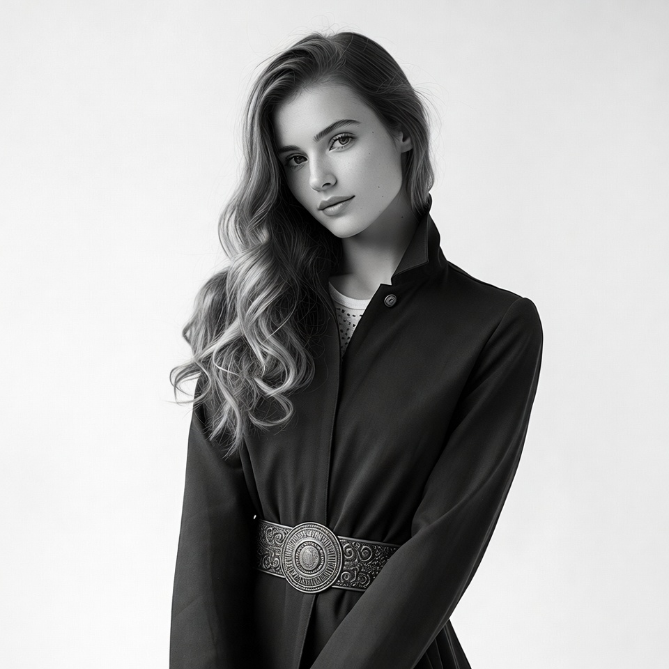 A young woman with long wavy hair poses confidently against a white background. She wears a black collared coat with a prominent ornate belt featuring intricate designs. Her expression is serene and direct gaze at the camera.