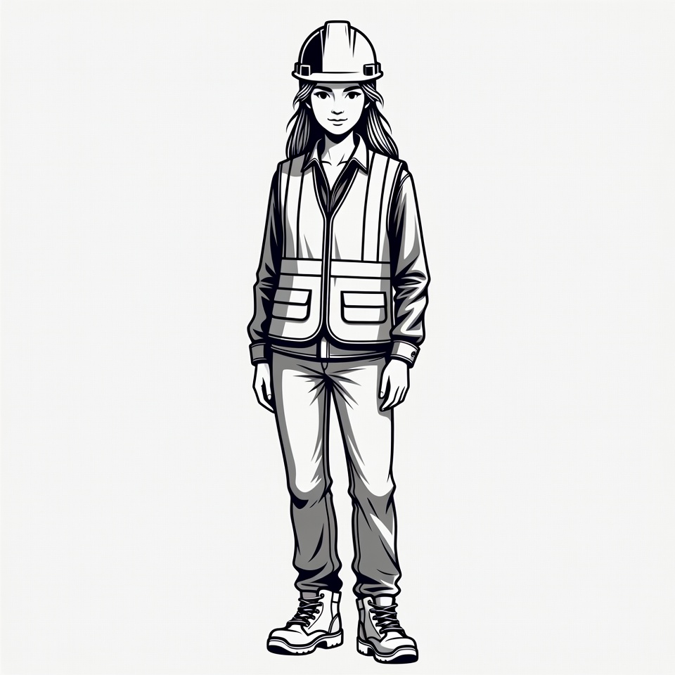 Asian, clipart, female, hard hat, illustration, isolated background, line art, pants, safety gear, safety vest, standing, uniform, woman, work boots, worker, young woman, construction worker