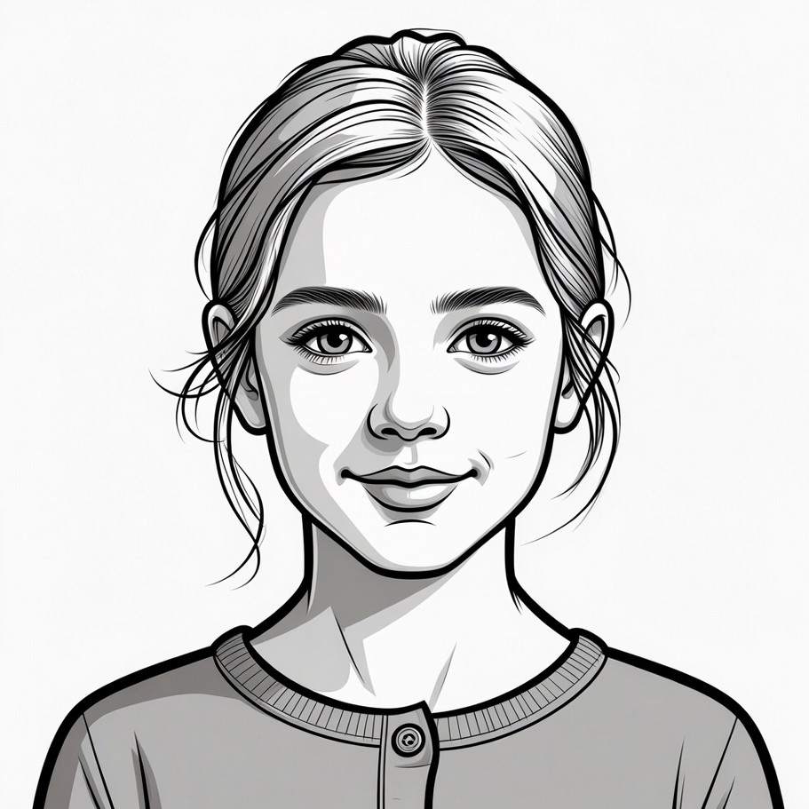 A line art illustration depicts a young girl with a gentle smile on her face. She has blonde hair tied back in a ponytail with loose strands framing her face and wears a collared shirt. Her large expressive eyes and soft features are rendered in detailed black and white sketch style on an isolated white background.