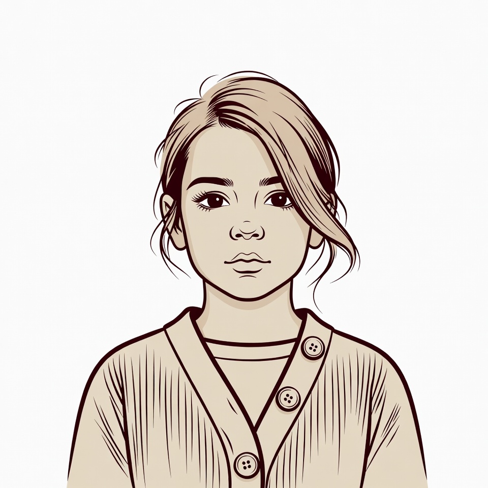 Line art illustration of a young girl with loose blonde hair facing forward on an isolated white background. She wears a textured cardigan sweater with buttons over a simple top. Her large expressive eyes and soft facial features are detailed in sketch style.