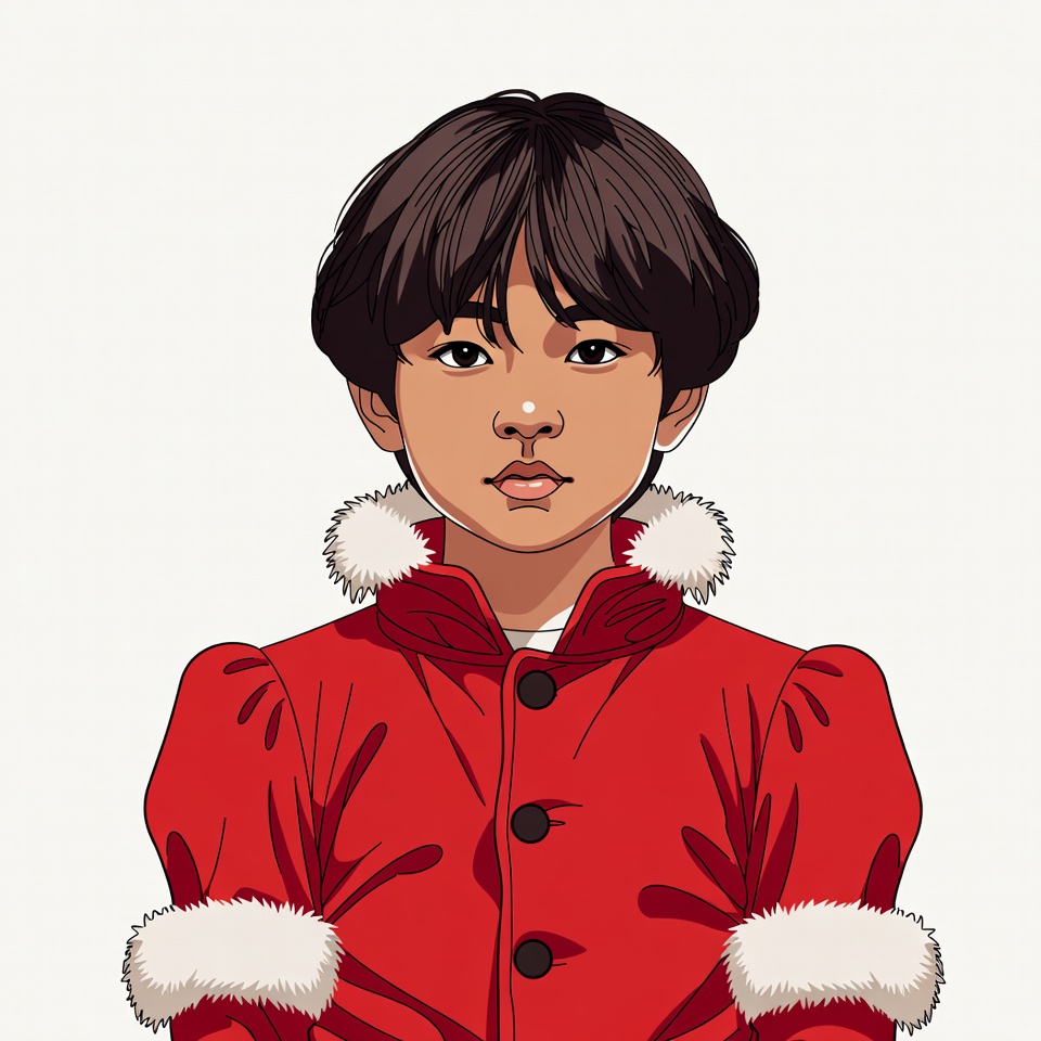 Asian, Christmas outfit, Santa coat, anime style, black buttons, cartoon, clipart, dark hair, front view, fur trim, illustration, isolated background, puffed sleeves, red coat, round face, short hair, white fur, young boy, boy