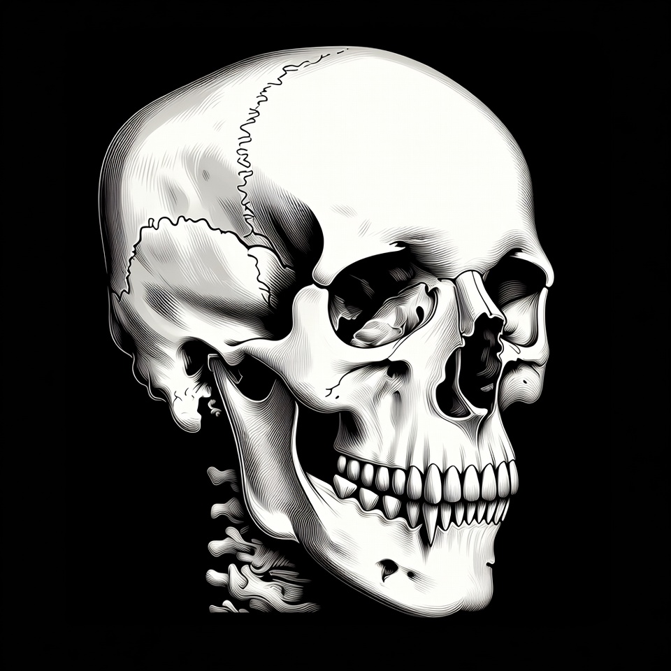 Halloween, anatomy, black background, bones, clipart, death, drawing, eye sockets, fangs, grinning skull, human skull, isolated background, jawbone, profile view, skeleton, skull illustration, spooky, teeth, white skull, skull