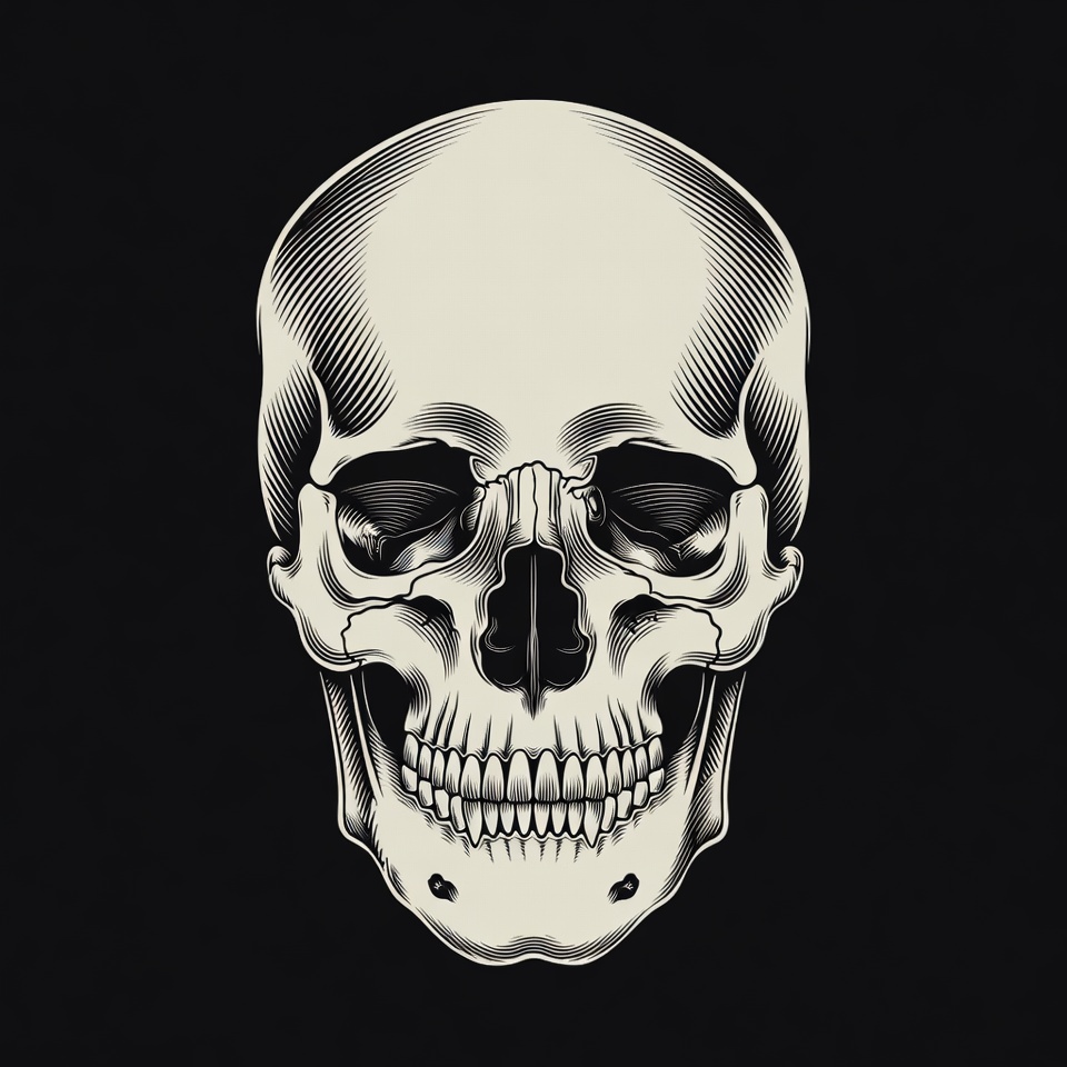 A detailed black and white line art illustration of a human skull on a black background. The skull features prominent eye sockets, nasal cavity, and teeth in a realistic anatomical style. It is rendered with intricate shading and contours for depth.