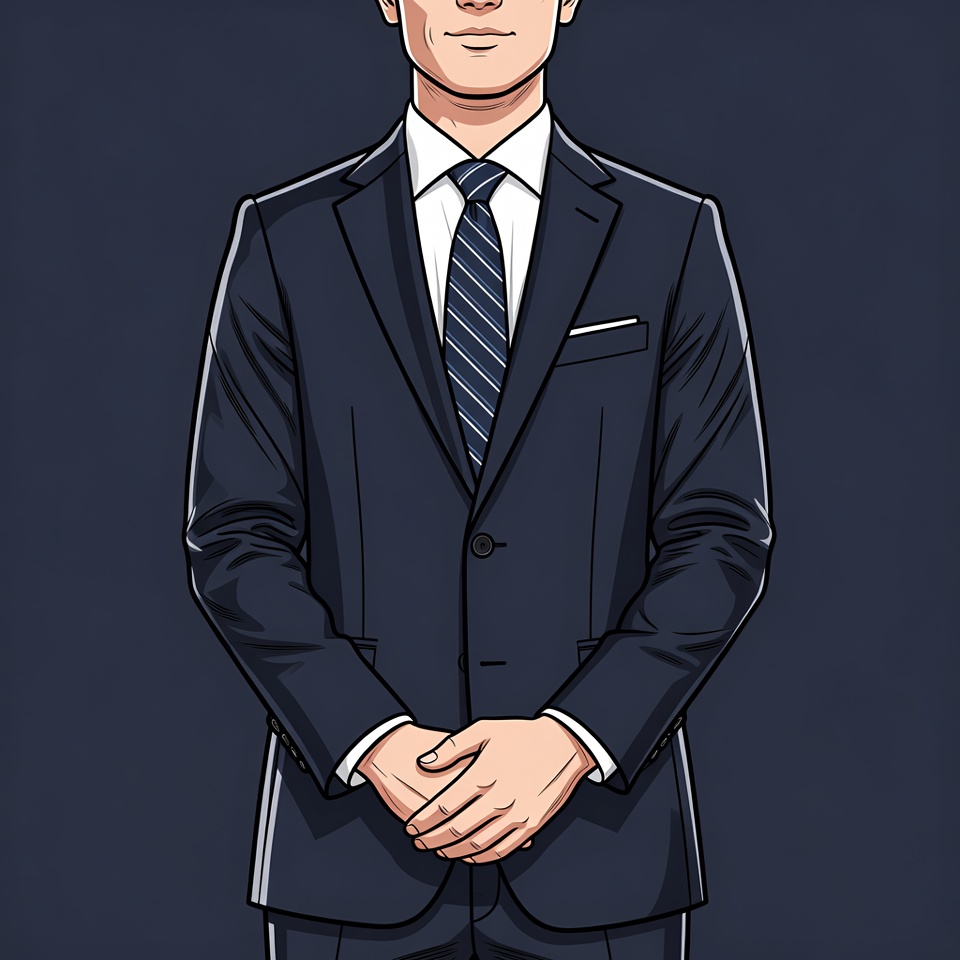 A cartoon illustration depicts a man standing with hands clasped in front of a dark solid background. He wears a navy blue suit, white dress shirt, striped tie, and pocket square. The style is clean line art with a professional appearance.