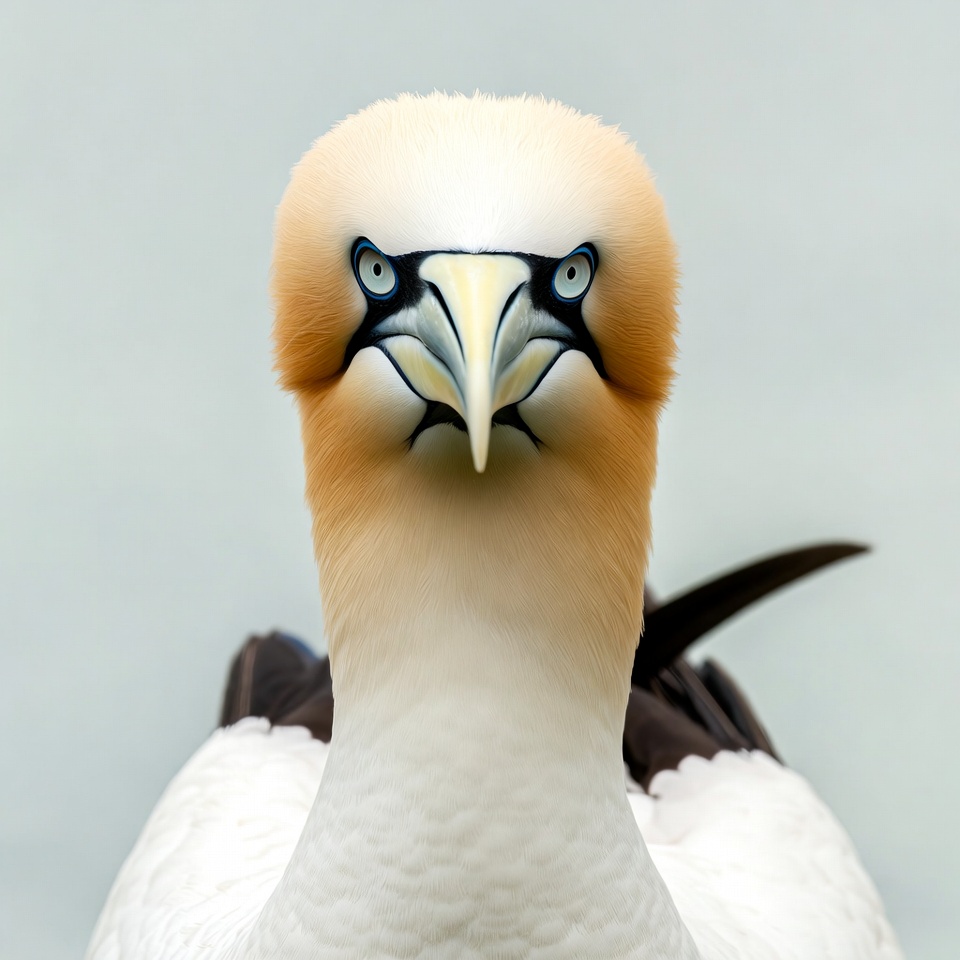 A Northern gannet faces forward with piercing blue eyes and a sharp yellow beak. Its head features white feathers accented by orange and black markings around the eyes and nape. The bird stands against a plain light gray background.