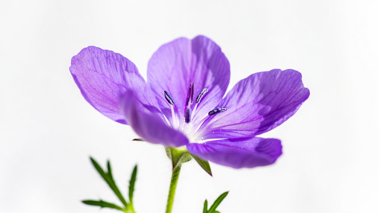 bloom, botany, closeup, five petals, floral, flower, geranium, green stem, isolated, macro, nature, petals, purple, purple flower, stamen, vibrant, white background, geranium flower