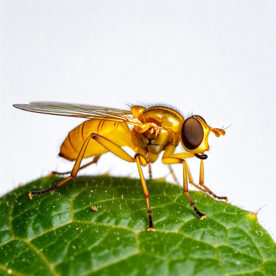 A close-up of a yellow hoverfly with shiny metallic body and large compound eyes stands on a green leaf. Its wings are slightly spread, and fine hairs cover its legs and thorax. The insect is positioned on the edge of the fresh green leaf against a white background.