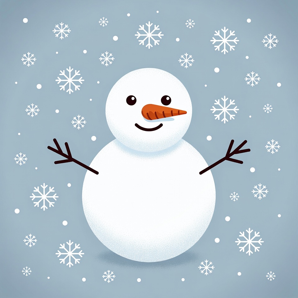 A cheerful cartoon snowman with a carrot nose and stick arms stands on a light blue background. White snowflakes fall around it, creating a winter scene. The illustration features a smiling face and simple, rounded body.