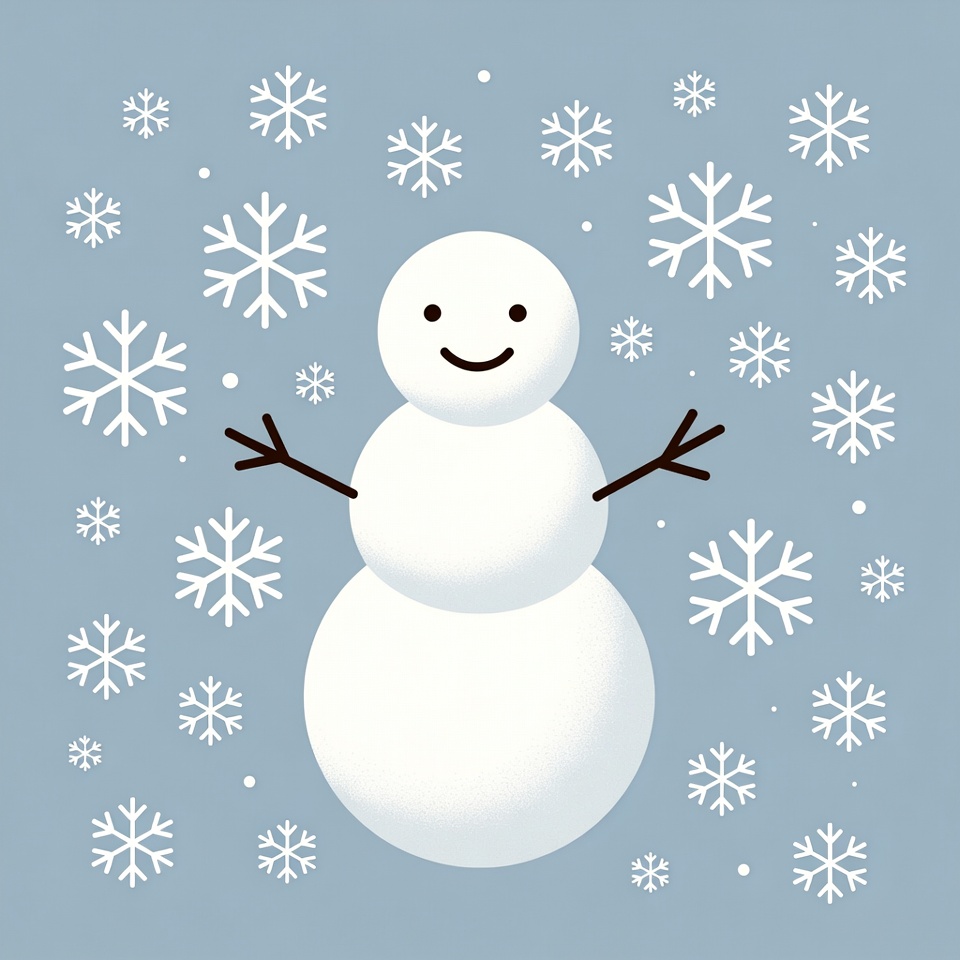 A cheerful snowman with a big smile stands on a light blue background surrounded by floating white snowflakes. It has three stacked snowballs for its body, thin black stick arms, and simple cartoon features. The illustration is vibrant and festive.