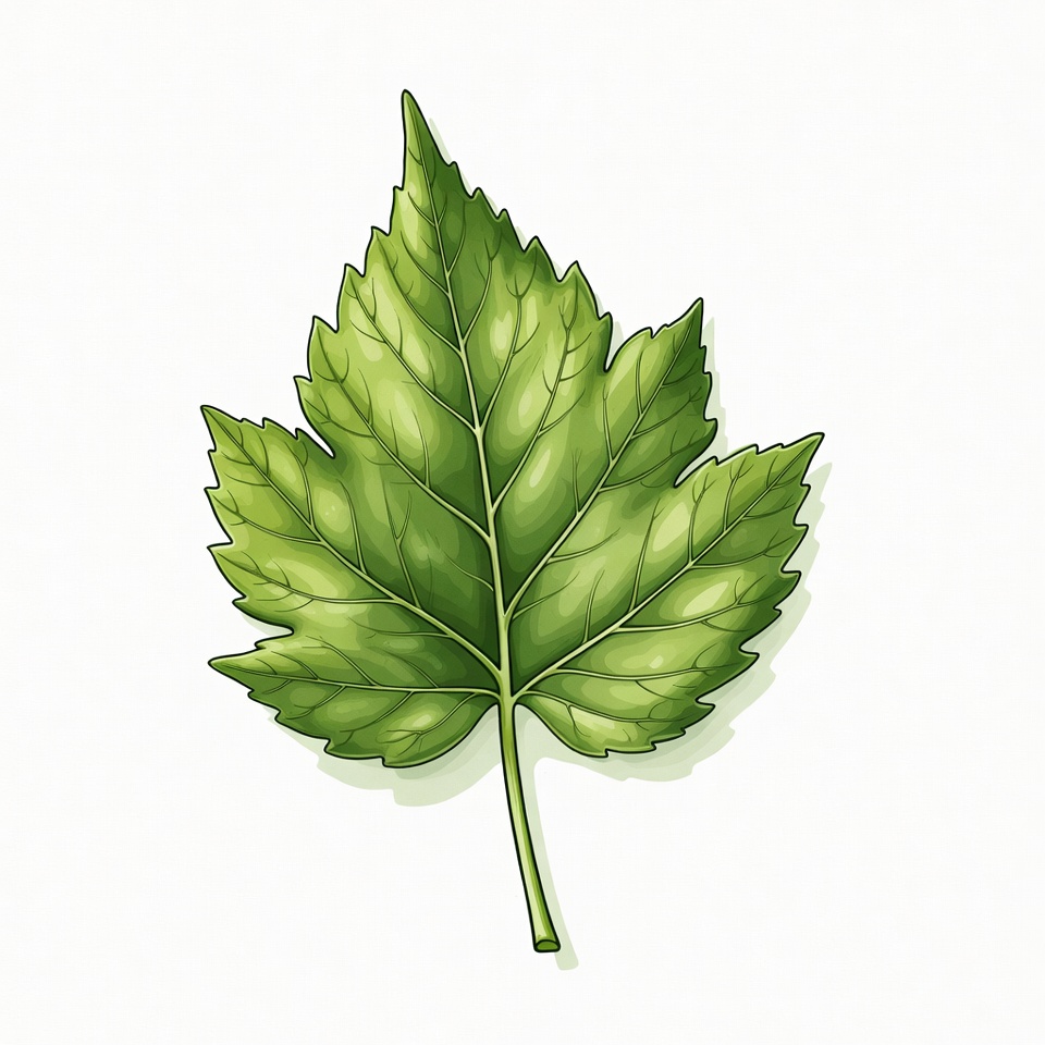 A vibrant green maple leaf illustration with serrated edges and prominent veins. It is depicted realistically on a white isolated background with a subtle shadow.