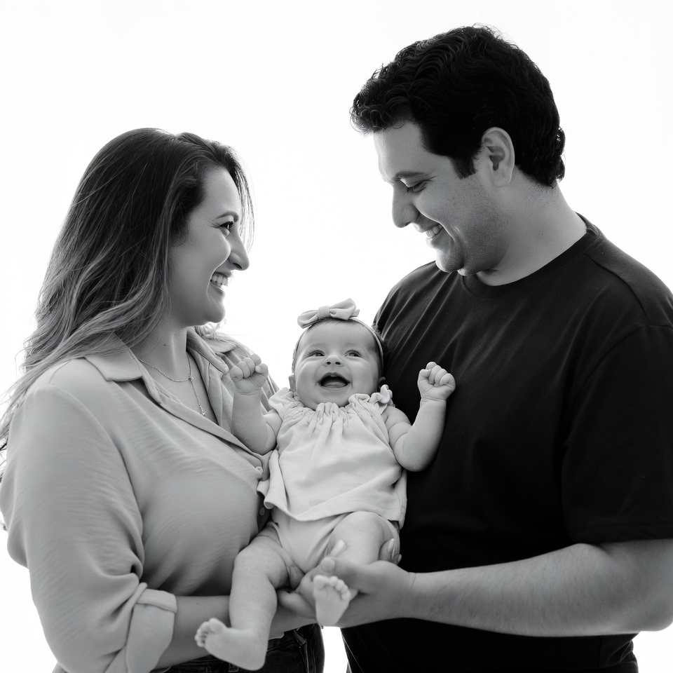 A smiling baby girl with a bow in her hair is held by her smiling mother and father in a black and white portrait. The mother wears a loose blouse with rolled sleeves and has long wavy hair, while the father is dressed in a t-shirt. They stand close together against a plain white background, gently supporting the baby's legs and arms.