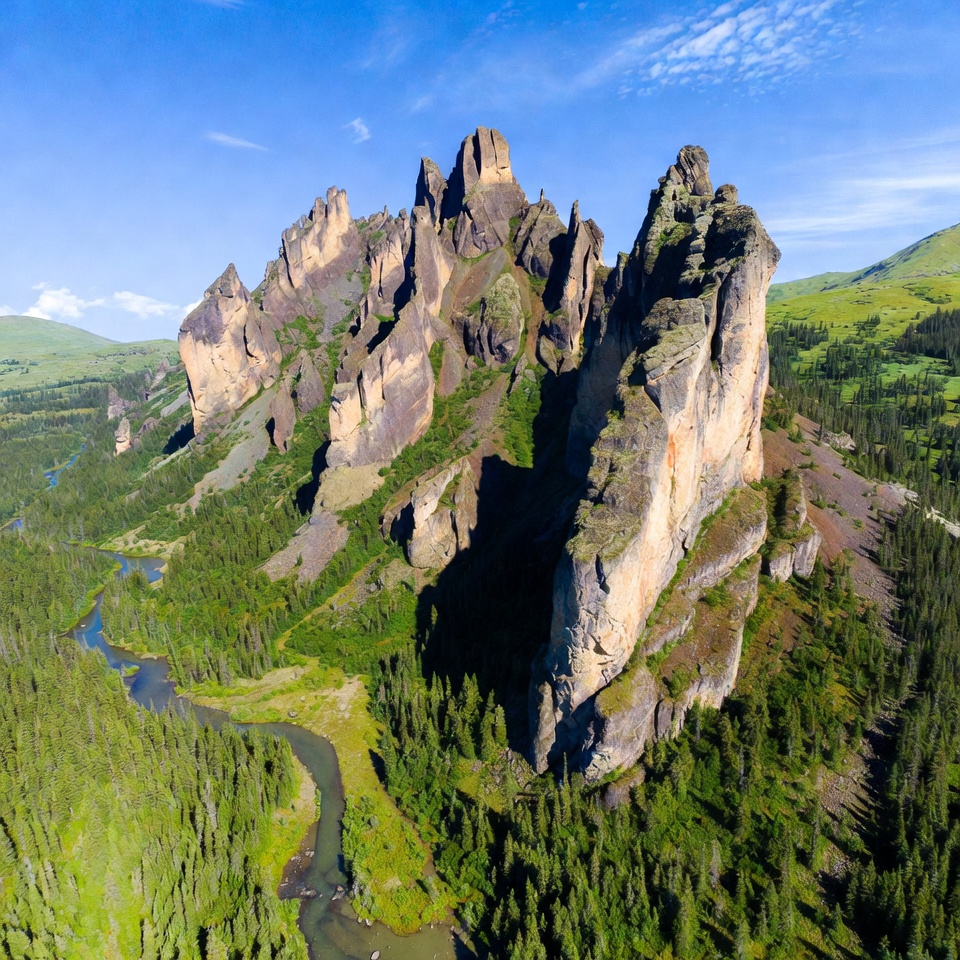 Aerial view of tall, jagged rock pinnacles rising sharply from a lush green valley. A winding river flows through the forested base, surrounded by rolling green hills under a clear blue sky with scattered clouds.