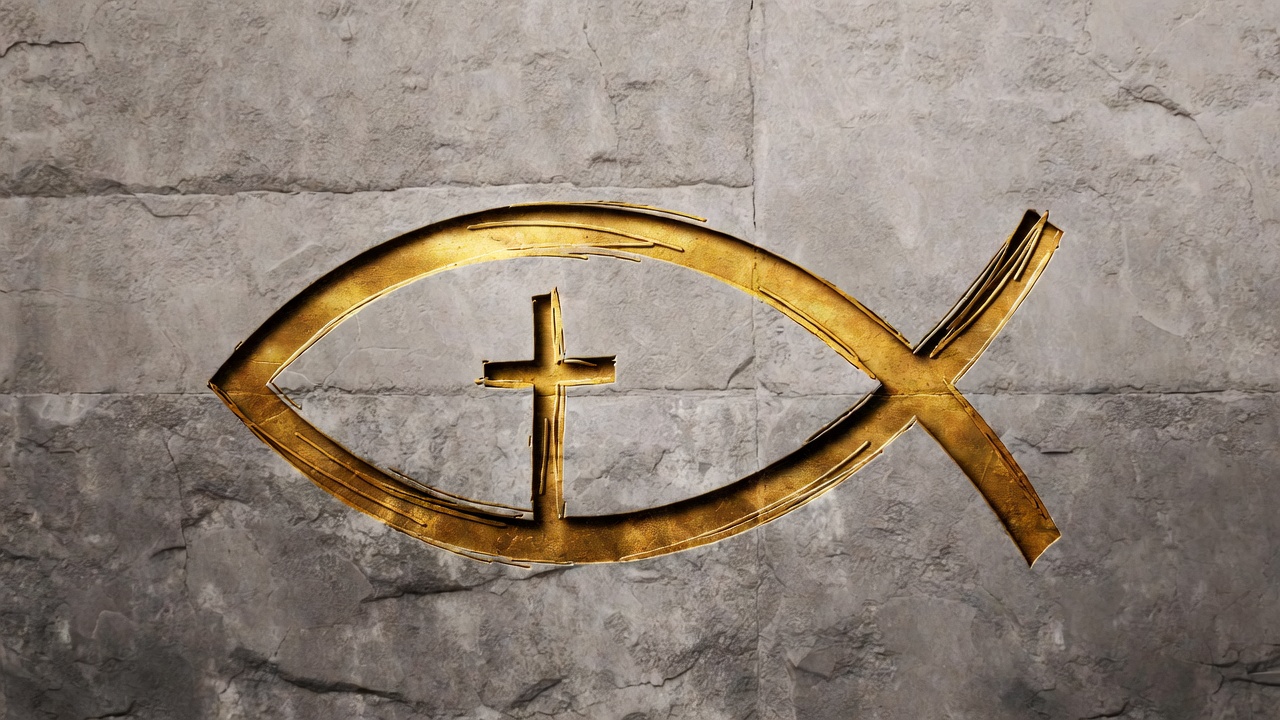 3D render, Christian fish, Christianity, Jesus fish, cross, faith icon, fish symbol, gold fish, gray background, isolated background, metallic gold, religious symbol, stone wall, symbol, Ichthys
