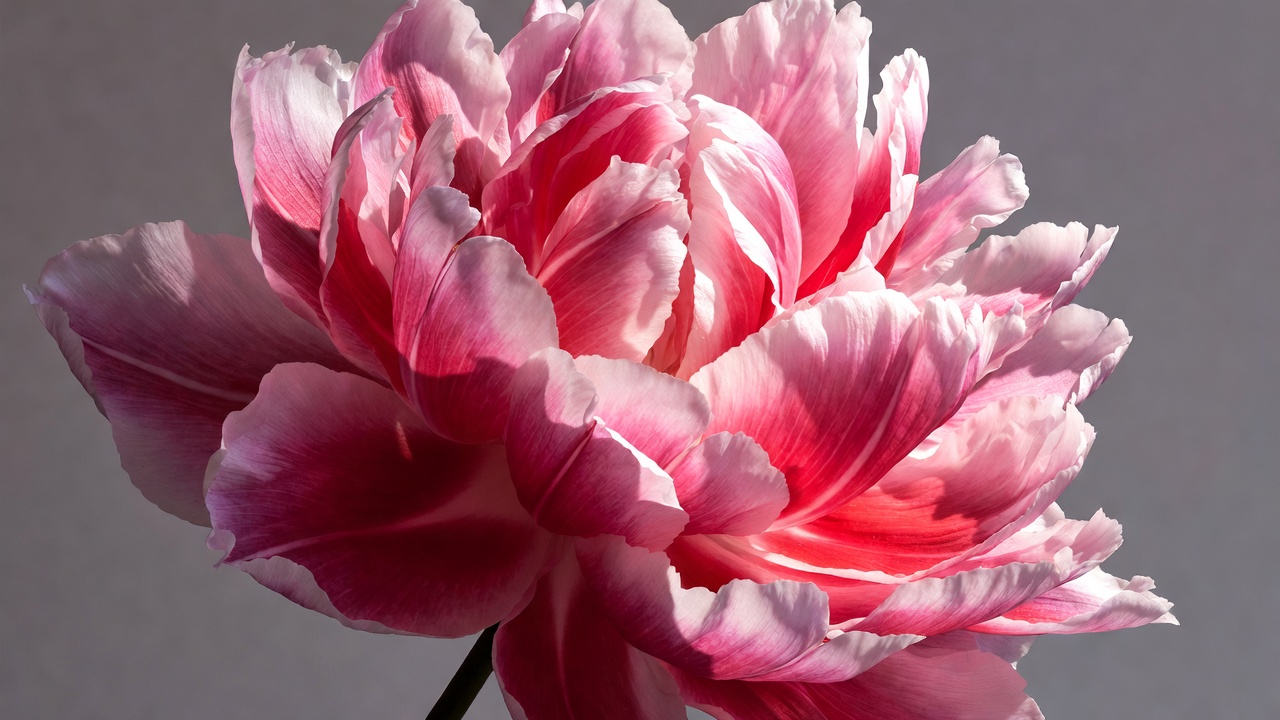bloom, botany, closeup, floral, flower, flower macro, flower stem, garden flower, gray background, green stem, isolated background, nature, peony bloom, petals, pink bloom, pink flower, pink peony, ruffled petals, white petals, peony