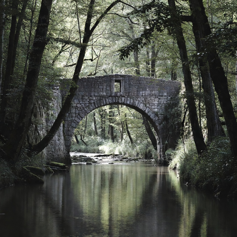 A historic stone arch bridge spans a calm river in a dense green forest. Sunlight filters through the tall trees, casting dappled light on the water and mossy bridge. The scene features lush foliage and a serene woodland path leading to the bridge.