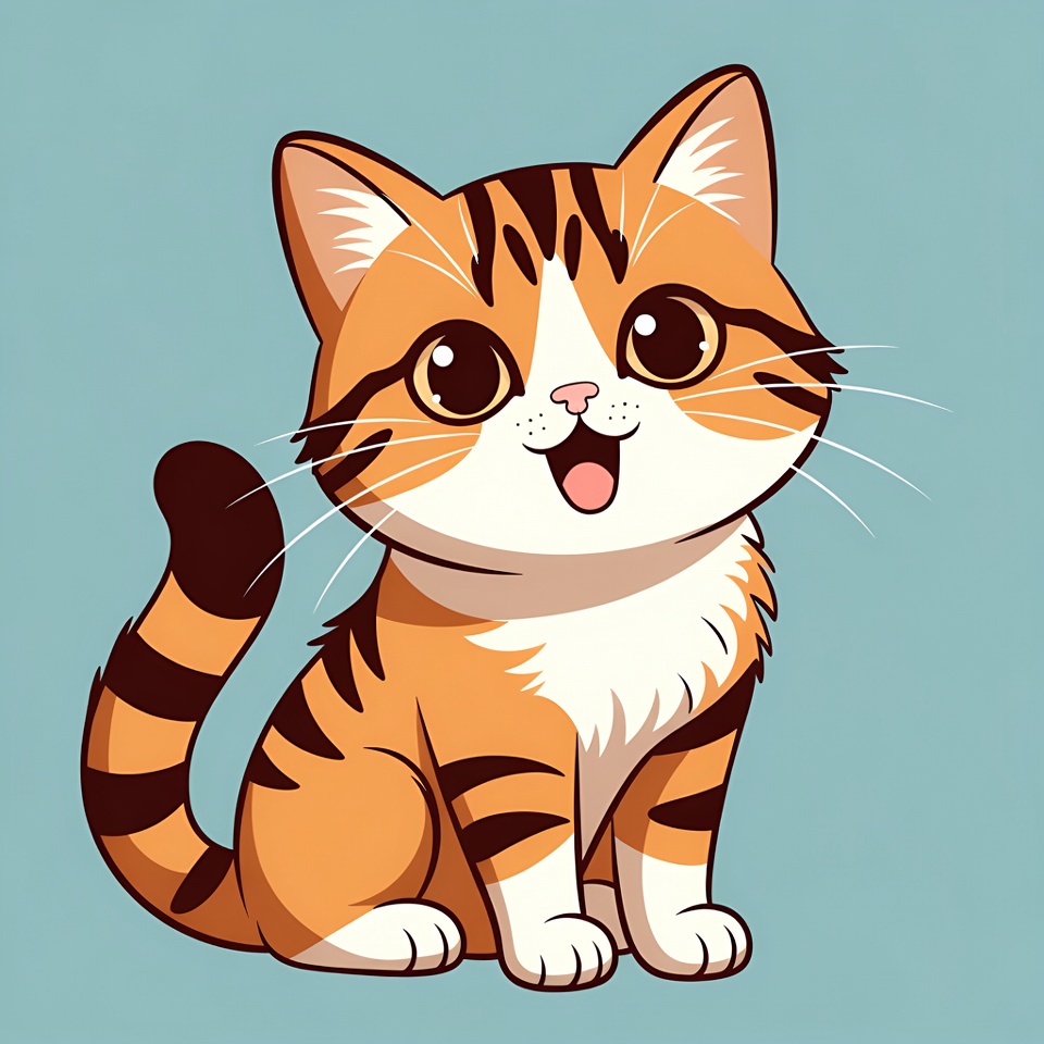 A vibrant cartoon illustration of an adorable orange tabby kitten with black stripes sits on a light blue background. The kitten has large expressive eyes, a wide happy smile showing its teeth, and a fluffy tail curled beside it. Its fur features white accents on the chest and paws.