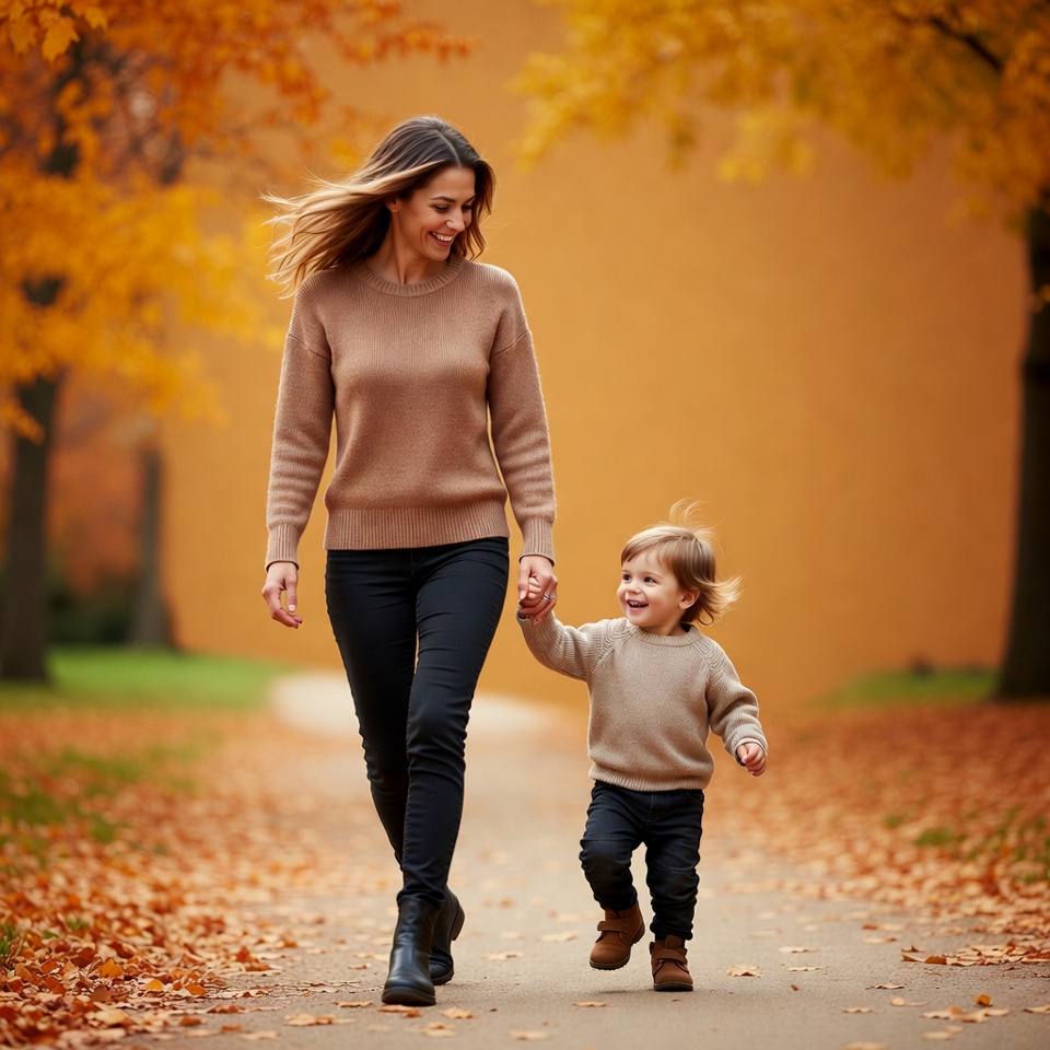 A smiling woman with long wavy hair holds hands with a joyful toddler boy as they walk along a tree-lined path covered in fallen leaves. She wears a beige sweater, black pants, and black boots, while the boy is dressed in a beige sweater and dark pants with brown boots. Vibrant yellow and orange autumn foliage surrounds them on a sunny day.