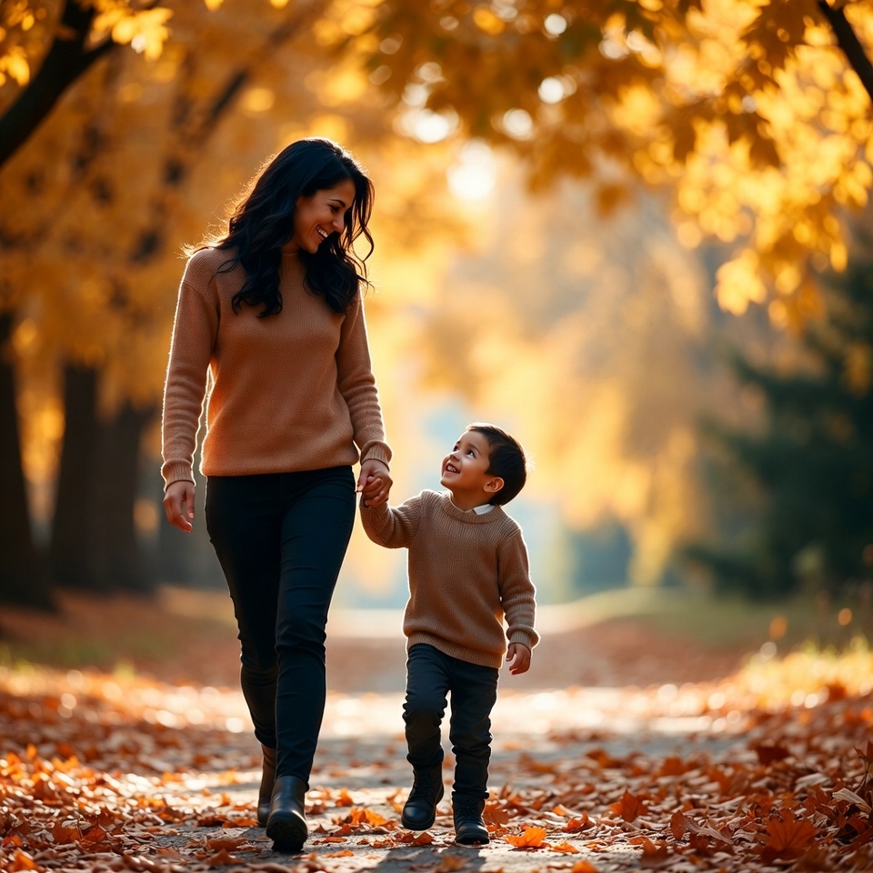 A smiling Latina mother with long dark hair holds hands with her young son as they walk down a tree-lined path covered in fallen leaves. She wears a beige sweater, black pants, and boots, while the boy is dressed in a matching sweater, collared shirt, pants, and shoes. Golden autumn foliage surrounds them under warm sunlight.