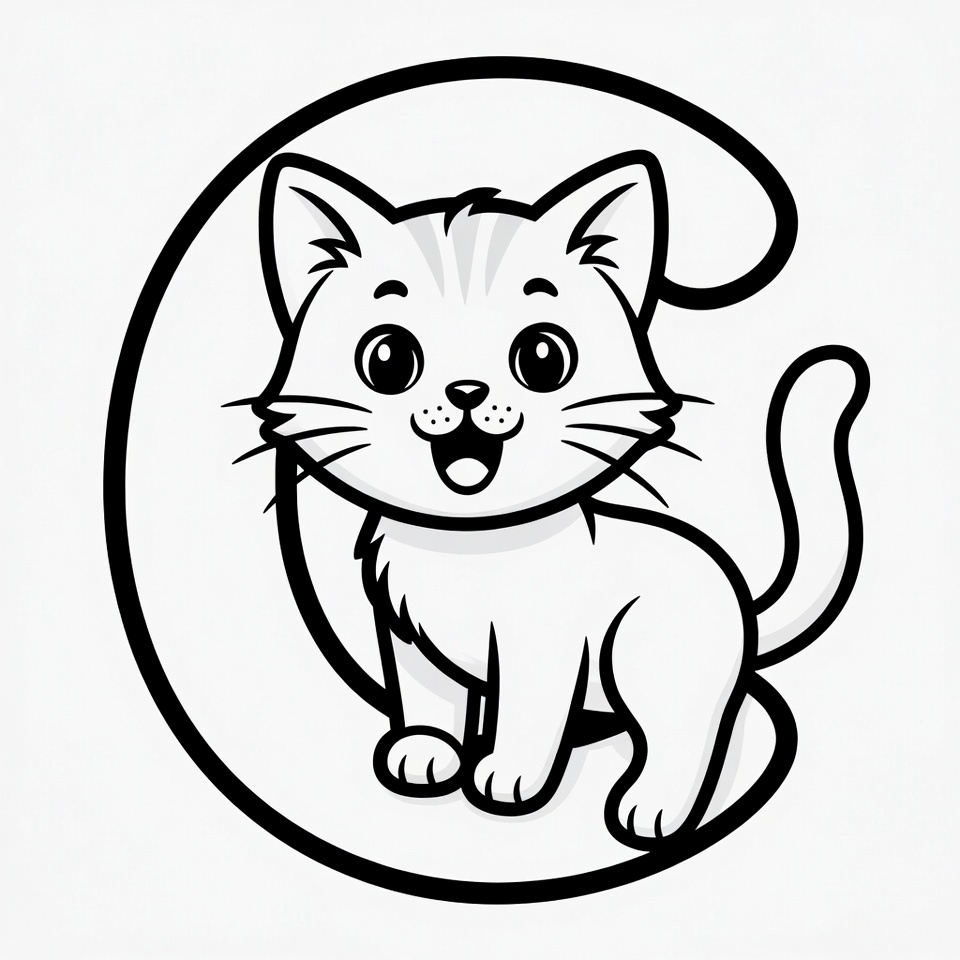 alphabet, animal, big eyes, black and white, cartoon, clipart, cute, fluffy fur, illustration, isolated background, kitten, letter C, line art, sitting cat, smiling cat, whiskers, cat