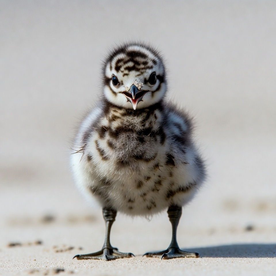A young piping plover chick stands on sandy beach with its fluffy black-and-white striped feathers. It faces forward with a slightly open beak and dark eyes. Thin legs and tiny feet are visible against the light-colored sand.